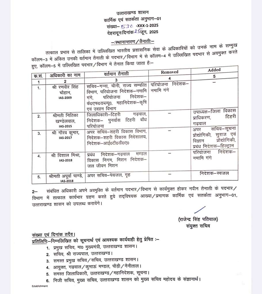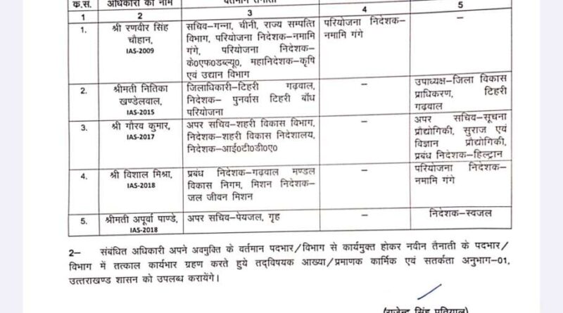 रणवीर सिंह चौहान से परियोजना निदेशक नमामि गंगे का पदभार हटा दिया गया है। हालांकि गन्ना, चीनी, राज्य संपत्ति विभाग और महानिदेशक कृषि एवं उद्यान के दायित्व उन पर यथावत रहेंगे।                                                  नितिका खंडेलवाल, जो हाल ही में टिहरी की जिलाधिकारी नियुक्त हुई हैं, को जिला विकास प्राधिकरण (DDA) का अतिरिक्त दायित्व सौंपा गया है।                              गौरव कुमार, अपर सचिव को सूचना प्रौद्योगिकी, सुराज एवं विज्ञान प्रौद्योगिकी विभागों के साथ-साथ हिल्ट्रान के प्रबंध निदेशक का अतिरिक्त जिम्मा दिया गया है।विशाल मिश्रा को परियोजना निदेशक नमामि गंगे के पद पर तैनात किया गया है। अपूर्वा पांडेय, अपर सचिव को निदेशक स्वजल का अतिरिक्त दायित्व सौंपा गया है।