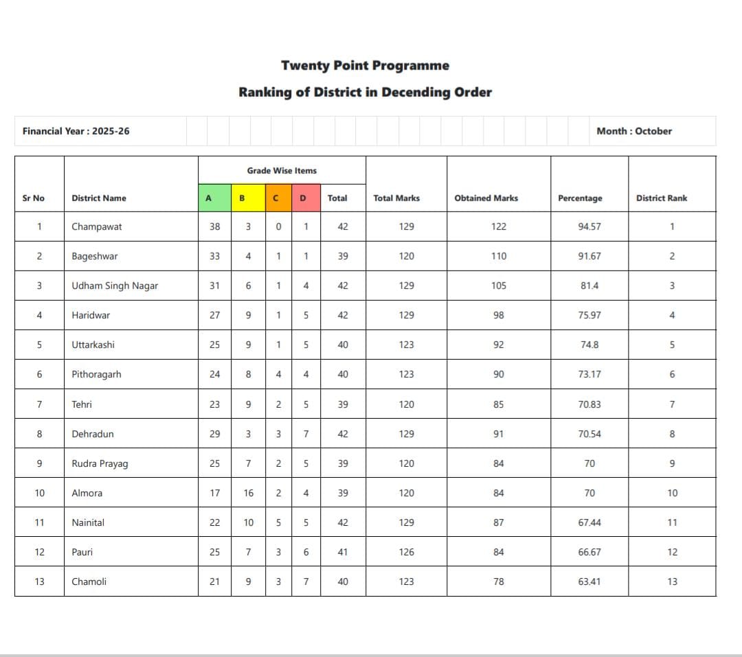 भारत सरकार के बीस सूत्रीय कार्यक्रम के क्रियान्वयन में चम्पावत अव्वल, ऊधमसिंहनगर तीसरे स्थान पर।