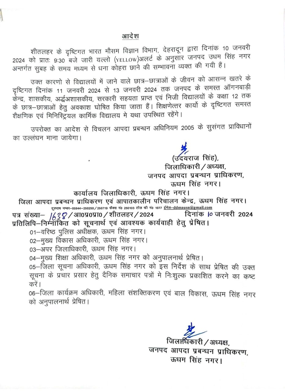 रुद्रपुर (खबर धमाका)‌ ऊधमसिंहनगर में पिछले दो सप्ताह से लगातार पड़ रही ठंड का सितम आने कुछ दिनों तक जारी रहेगा। मौसम विभाग के अलर्ट के बाद जिलाधिकारी उदयराज सिंह ने 13 जनवरी तक स्कूलों और आंगनबाड़ी केंद्रों पर बच्चों की छुट्टियां कर दी है।