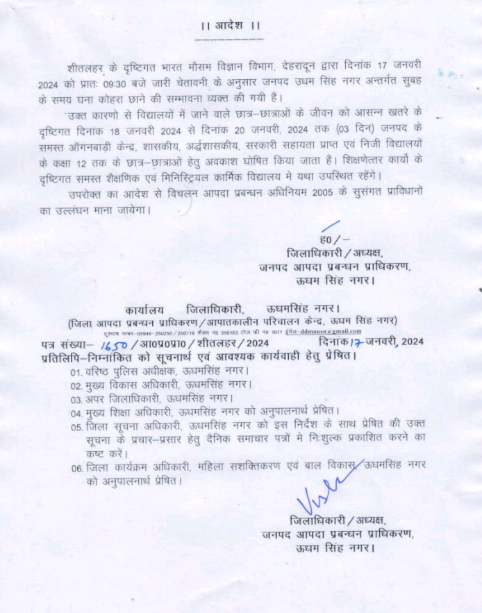ठंड का सितम, ऊधमसिंहनगर में स्कूलों की फिर छुट्टी।मौसम विभाग के अलर्ट पर डीएम ने दिया आदेश