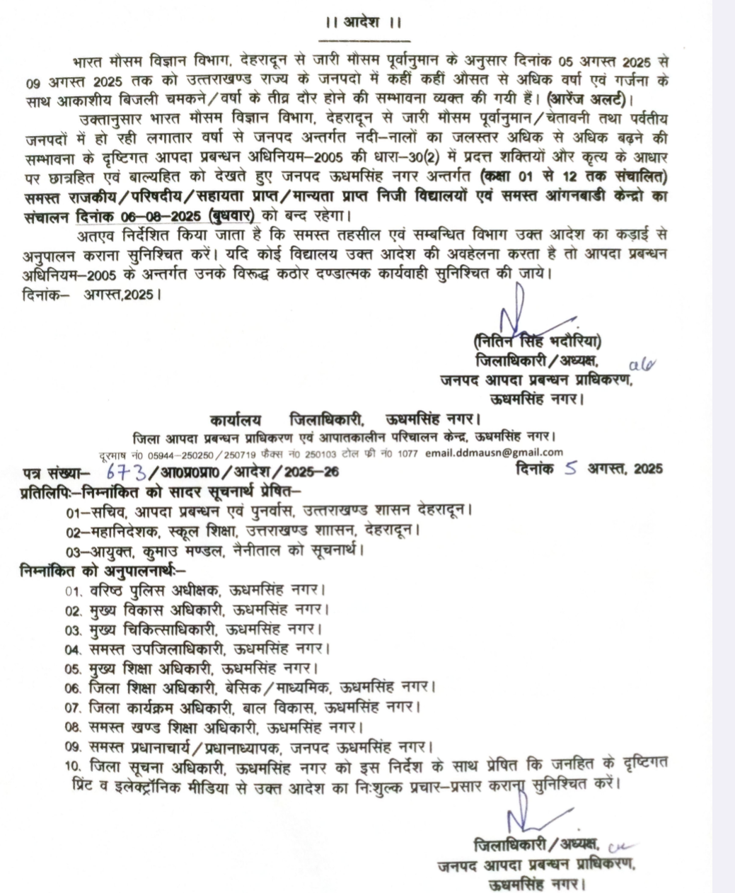 रुद्रपुर(खबर धमाका)। ऊधमसिंहनगर समेत प्रदेश के सभी जनपदों में पिछले 24 घंटे लगातार हो रही बारिश और मौसम विभाग के पुर्वानुमान के चलते बुधवार को भी एक से लेकर इंटर तक स्कूल, आंगनबाड़ी केंद्रों को बंद रखने के आदेश दिए हैं। डीएम ने आदेश की अवेहलना करने वालों के खिलाफ सख्त कार्रवाई के निर्देश भी दिए हैं।
