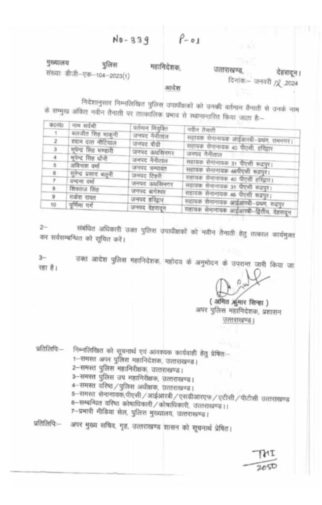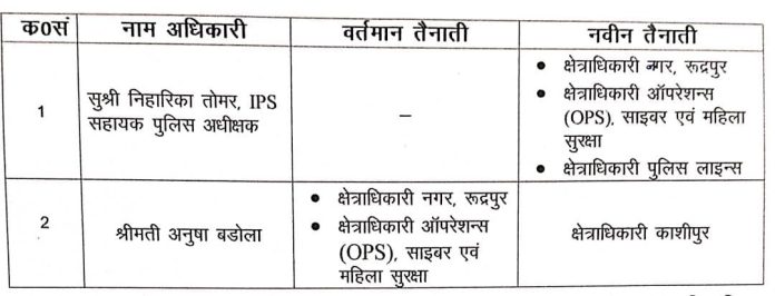 उत्तराखंड आईपीएस निहारिका तोमर सीओं सिटी, बडोला को भेजा काशीपुर उत्तराखंड में 10 पुलिस उपाधीक्षको का स्थानांतरण जनवरी 13, 2024 KHABAR DHMAKA नरेन्द्र राठौर रुद्रपुर (खबर धमाका)। सरकार ने प्रदेश में 10 पुलिस उपाधीक्षको का स्थानांतरण कर दिया है। ऊधमसिंहनगर की सीओं सिटी अनुषा बडोला को काशीपुर का सीओं बनाया गया है। उनकी जगह आईपीएस निहारिका को सीओं सिटी की जिम्मेदारी सौंपी गई है।
