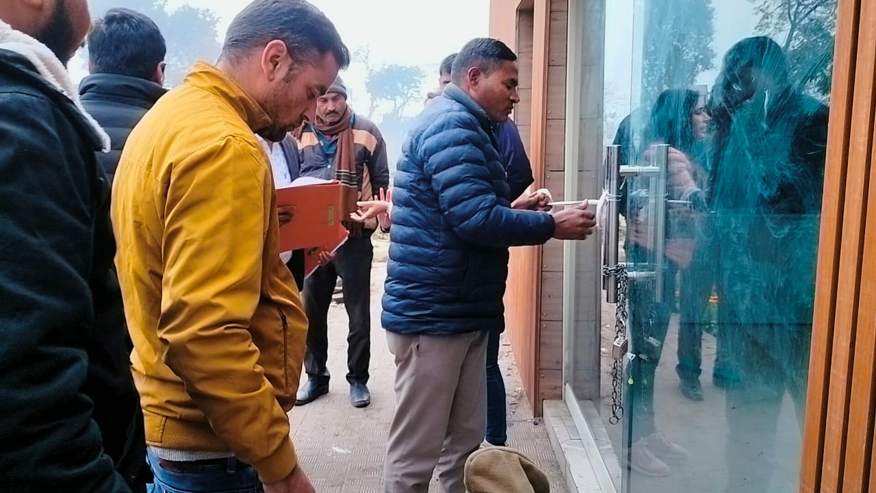 किच्छा में अवैध कालौनी के दफ्तर को सील करते प्रशासन के कर्मी