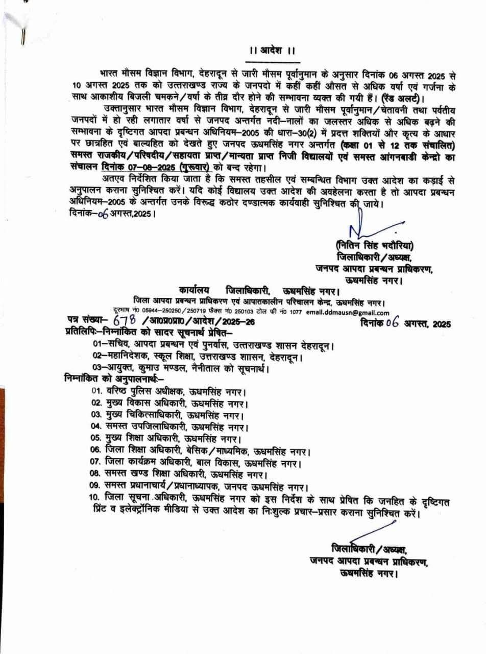 रुद्रपुर(खबर धमाका)। पिछले कई दिनों से हो रही बारिश के बाद मौसम विभाग ने गुरुवार को भी बारिश का अलर्ट जारी किया है, जिसके चलते ऊधमसिंहनगर के डीएम नितिन सिंह भदौरिया ने कक्षा एक से 12 तक के स्कूलों को बंद रखने के आदेश जारी कर दिए हैं।