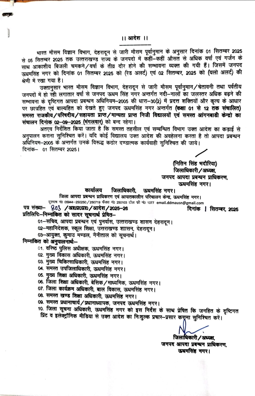 ऊधमसिंहनगर में मंगलवार को भी बंद रहेंगे स्कूल।मौसम विभाग के पुर्वानुमान पर डीएम ने जारी किए आदेश