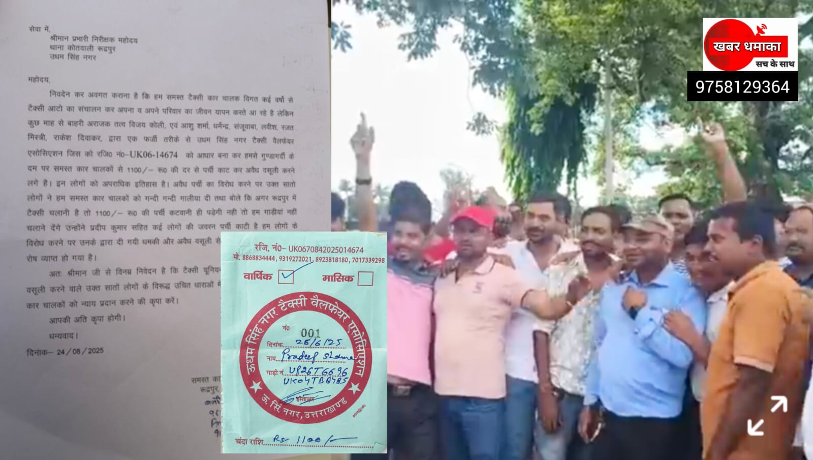 रविवार को रुद्रपुर के नैनीताल रोड पर गांधी पार्क के बाहर टैक्सी चालकों ने प्रदर्शन के दौरान बताया कि टैक्सी कार चालक विगत कई वर्षों से टैक्सी आटो का संचालन कर अपना व अपने परिवार का जीवन यापन करते आ रहे है लेकिन कुछ माह से बाहरी अराजक तत्व विजय कोली, एवं आशु शर्मा, धर्मेन्द्र, संजूवाबा, लवीश, रजत मिस्त्री, राकेश दिवाकर, द्वारा एक फर्जी तरीके से उधम सिंह नगर टैक्सी वैलफेयर एसोसिएशन जिस को रजि० नं०-UK06-14674 को आधार बना कर हमसे गुण्डागर्दी के दम पर समस्त कार चालकों से 1100/- रू० की दर से पर्ची काट कर अवैध वसूली करने लगे है। इन लोगों को अपराधिक इतिहास है। अवैध पर्ची का विरोध करने पर उक्त सातो लोगों ने हम समस्त कार चालकों को गन्दी गन्दी गालीया दी तथा बोले कि अगर रूद्रपुर में टैक्सी चलानी है तो 1100/- रू0 की पर्ची कटवानी ही पड़ेगी नही तो हम गाड़ीयां नहीं चलाने देंगे उन्होंने प्रदीप कुमार सहित कई लोगों की जवरन पर्ची काटी है हम लोगों के विरोध करने पर उनके द्वारा दी गयी धमकी और अवैध वसूली से हम समस्त चालकों में भारी रोष व्याप्त हो गया है।