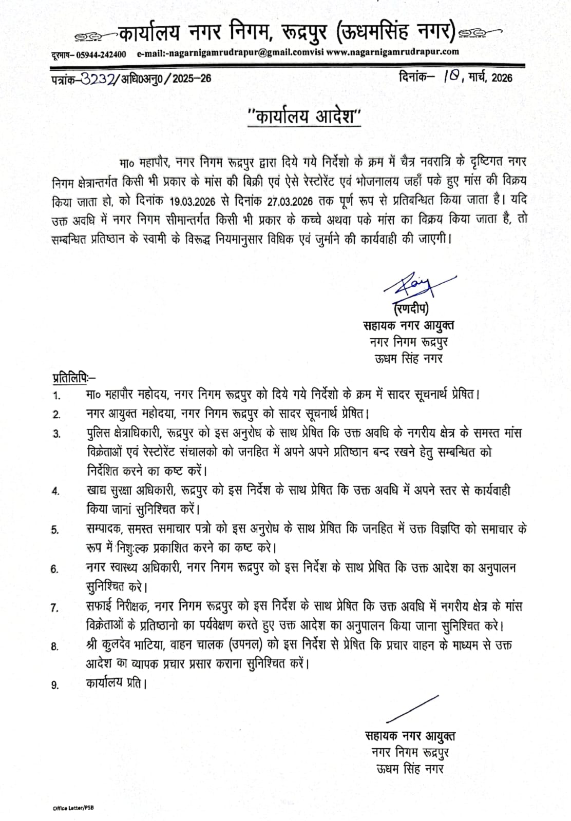 रुद्रपुर(खबर धमाका)। चैत्र नवरात्र के पावन पर्व को देखते हुए नगर निगम प्रशासन ने शहर की आध्यात्मिक मर्यादा और स्वच्छता बनाए रखने के लिए बड़ा निर्णय लिया है। नगर निगम क्षेत्र के अंतर्गत मीट-मांस की बिक्री पर पूर्ण प्रतिबंध लगा दिया गया है। यह आदेश 19 मार्च से प्रभावी होकर नवरात्र की समाप्ति यानी 27 मार्च 2026 तक कड़ाई से लागू रहेगा।
