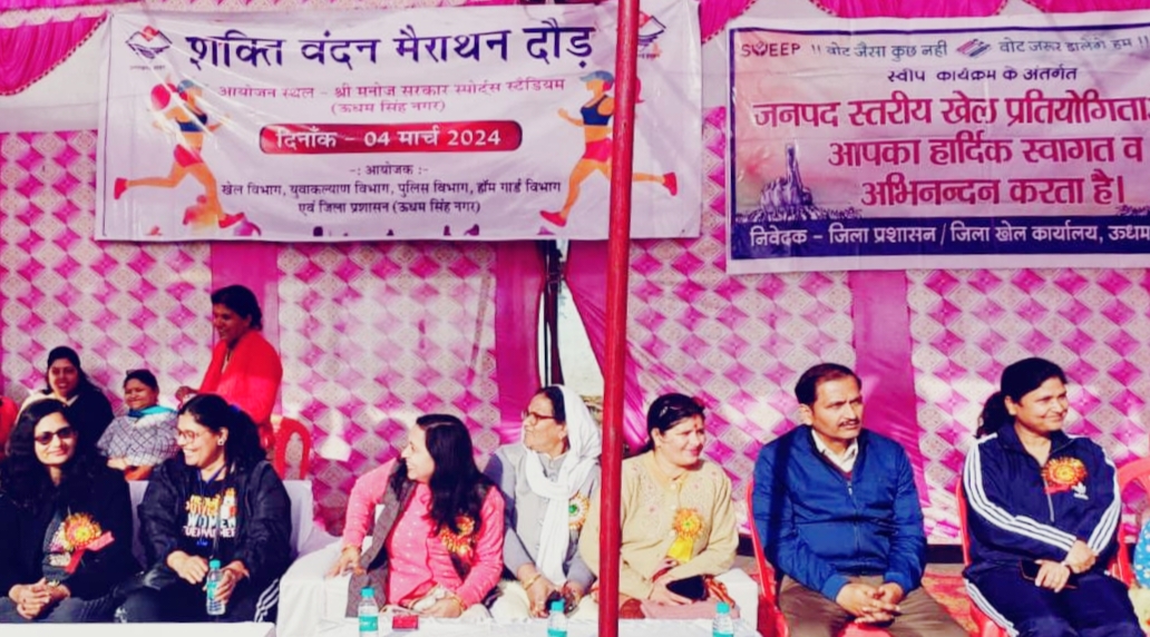 रुद्रपुर (खबर धमाका)। रुद्रपुर में नारी शक्ति वंदन कार्यक्रम के तहत प्रशासन द्वारा मैराथन का आयोजन किया गया,जिसमें धावकों के लिए आंगनबाड़ी ,बाल विकास एवं युवा कल्याण विभाग आदि के महिलाओं ने इस प्रतियोगिता में भाग लिया