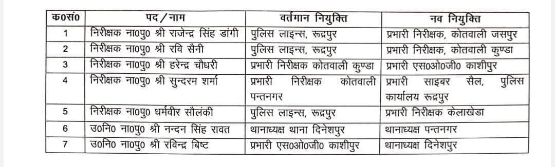 ऊधमसिंहनगर में सात निरीक्षक-उपनिरीक्षको के स्थानांतरण।पुलिस लाइन में तैनाती का इंतजार कर रहे इंस्पेक्टरों को मिली तैनाती